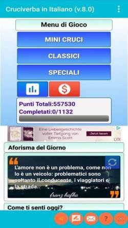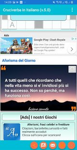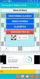 Crosswords in Italian Free, Medium-high levelItalian Crosswords (Crosswords) for Android, is a puzzle game that offers the opportunity to play and have fun with the classic crosswords.The Crosswords are available in three different sizes:The total schemes available are 280:- 90 crosswords of 9x9 size- 70 crosswords of 11x11 size- 60 crosswords of 13x13 size- 60 crosswords of 15x15 size- 12 Crossword puzzles without schemeThe definitions of crossword puzzles are of medium / high difficulty.The solution is always available and also a button to check thecorrectness of the definitions inserted.It is also possible to enable advanced aids to show a single letter or a whole word.A PRO version of crossword puzzles is also available, with many more diagrams and without any advertising.Forward the pro version of the crossword puzzle game to join the new patterns that will be created from time to time.Try also the other puzzle games we've created:- Crucipuzzle- Crucyning- Mathematical Crosswords- Enigmatic changesHave fun