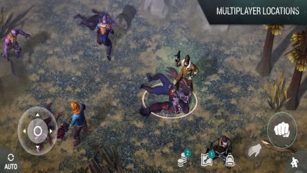 The game uses a third-person top-down view and a typical mobile action game interface: a heads-up display showing lootable items and enemies is placed in the upper right corner, movement controls and special skills are in the lower left corner, and motion controls such as attack, secondary, interaction, and special moves are in the lower right corner.