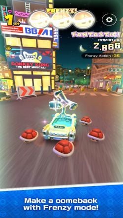 Mario Kart Tour is a racing game. Unlike other games in the series, this game has been greatly simplified for the limitations of mobile devices: during the race, the direction of throwing props is controlled by forward and backward, and the direction of turning the truck is controlled by left and right, without any action for forward or backward. The number of laps per race is also reduced from three or more to two (except for "3DS Rainbow Road"), and the number of players is fixed at eight. Each Cup consists of three different tracks and one technical level (e.g. time trial). The chances of trucks leaving the main track are significantly reduced, except for hidden routes to specific tracks. There is no cooldown time for prop boxes, and all players are bound to receive a prop when they pass a specific location.