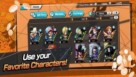 One Piece Bounty Rush has a team of four players competing against another team of four players in real time, with each battlefield based on a location in the One Piece series. The team with the most coins at the end of the battle wins. Players can level up their characters by collecting in-game items from the story mode or battlefields.