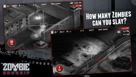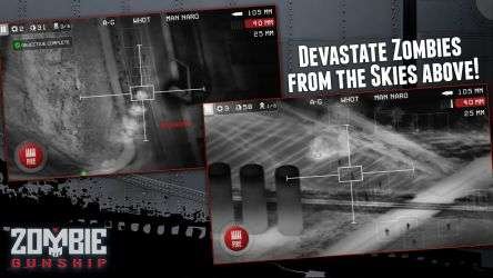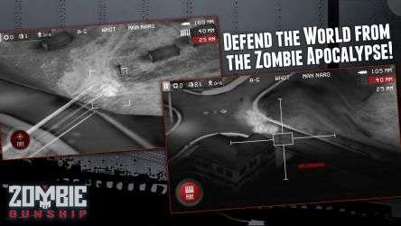 Zombie Gunship is a first-person shooter with 3D thermal imaging display in which the player is a gunner who fires at zombies from a heavily armed AC-130 ground attack aircraft around a variety of user-selected maps.